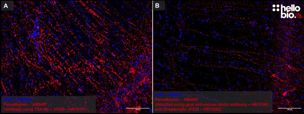 Figure 1: Representative images of Tyramide Signal Amplification compared to detection using a biotin secondary antibody with fluorescent streptavidin. A TSA of parvalbumin in the rat hippocampus using TSA kit – Janelia Fluor® 525 (HB19791). B Detection of parvalbumin using HB11345 goat anti-mouse (biotin) secondary antibody and Streptavidin Janelia Fluor® 525 (HB15382). Images were taken under identical conditions.