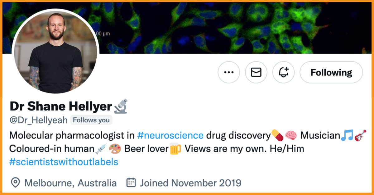 Your profile description/bio can influence whether a user decides to follow you or not. It must be clear and up-to-date. Insert links where possible, for example a link to your lab or institute’s own Twitter profile, and any other relevant associations you might be involved with. You can also add the '#' of topics that you frequently cover. Your future followers should know at a glance what to expect if they follow your account. It can also be a nice touch to add emojis to your bio, to give a visual representation of not only your professional interests but your personal interests too. Take a look at this great example from postdoc Dr Shane Hellyer of Monash University, Australia: