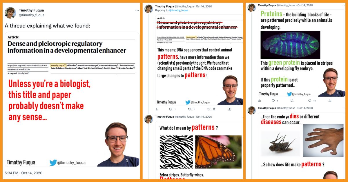 Here’s a great example from postdoc Timothy Fuqua of the Andreas Wagner Lab at the University of Zurich, who shared some of his findings through an eye-catching thread of explainer images: