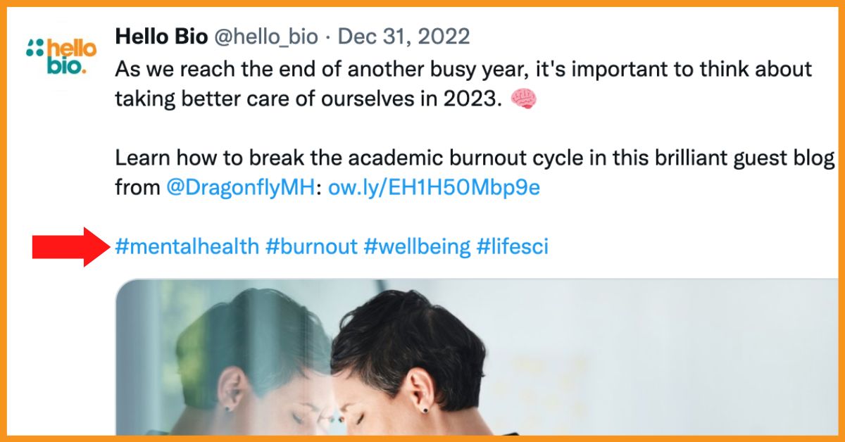 In Hello Bio’s final tweet of 2022 they took the opportunity to reshare a fantastic guest blog post on burnout in academia by the team at Dragonfly Mental Health. They included the hashtags #mentalhealth, #burnout and #wellbeing so that the tweet would be grouped with other articles on the same topic, maximising its chances of being found by others searching for similar content: