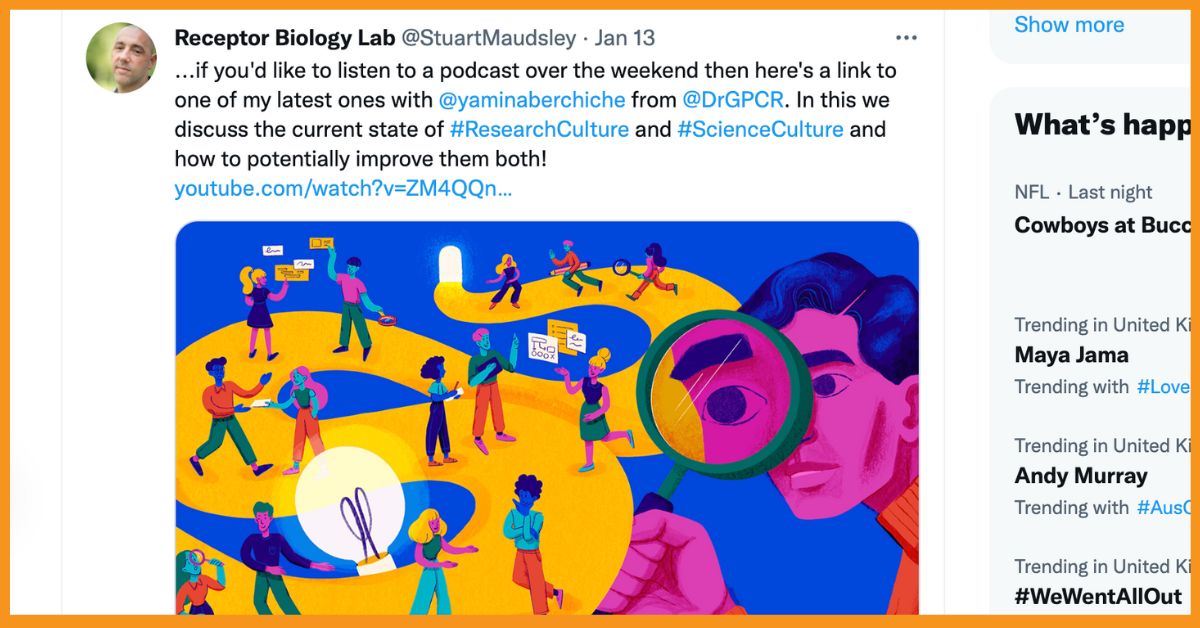 In this example, Professor Stuart Maudsley of the University of Antwerp uses a colourful and eye-catching image to share a link to a podcast recording. He also links to the Twitter handles of those involved and uses hashtags relevant to the topic of the podcast: