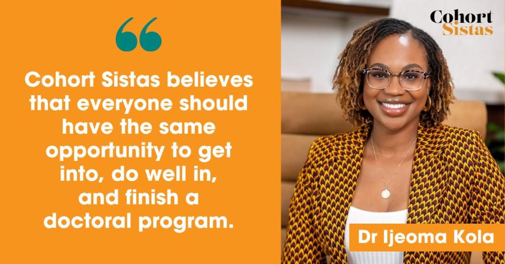 Joanne: Dr. Ijeoma Kola, the founder of Cohort Sistas, was the first in her family to pursue doctoral education and faced numerous professional, financial, and socio-emotional hurdles, including lack of mentorship, isolation as the only Black woman in many of her classes, and financial strain. In July 2020 Ijeoma founded Cohort Sistas to address underrepresentation and these unique challenges faced by Black women in doctoral programs.