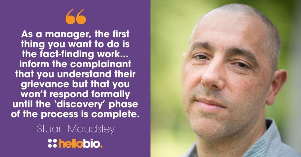 Stuart refers to this initial data-gathering mission as the ‘discovery phase’ of the process. He said: “It's a bit like handling a legal case. As a manager, the first thing you want to do is the fact-finding work, what they call in the legal field 'discovery'. It’s only through this phase that you’ll truly begin to understand what has happened, so inform the complainant that you understand their grievance, but that you won’t respond to them formally until the ‘discovery’ phase of the process is complete.”