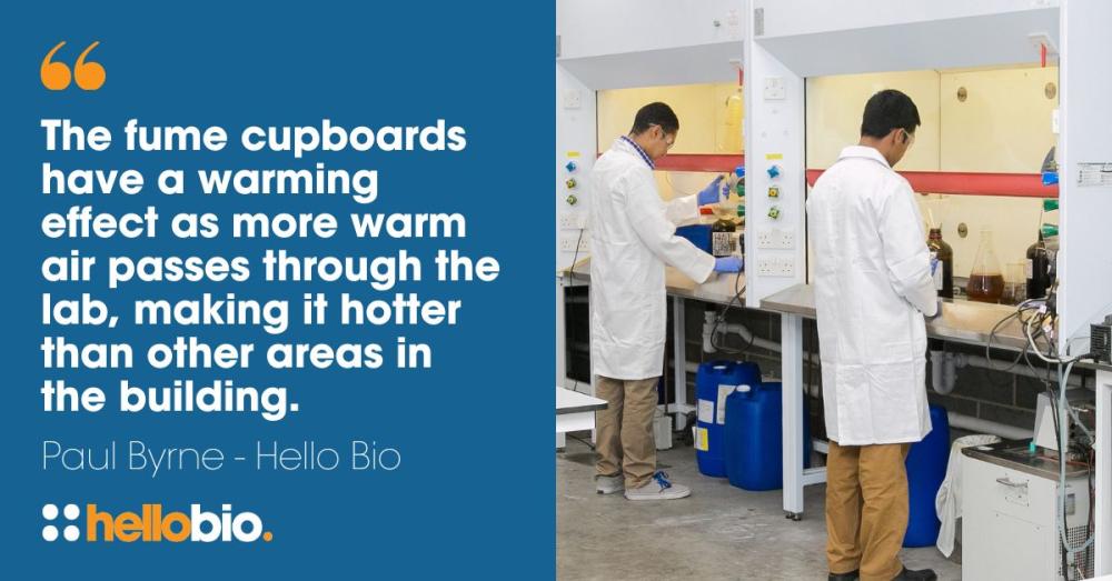 Paul Byrne, Head of Chemistry at Hello Bio’s UK labs, told us about the essential equipment that generates the most heat. He said: “The fume cupboards have a warming effect as more warm air passes through the lab, making it hotter than other areas in the building. Our stock room is probably the hottest room due to all of the fridges and freezers that are situated in a relatively small space.”