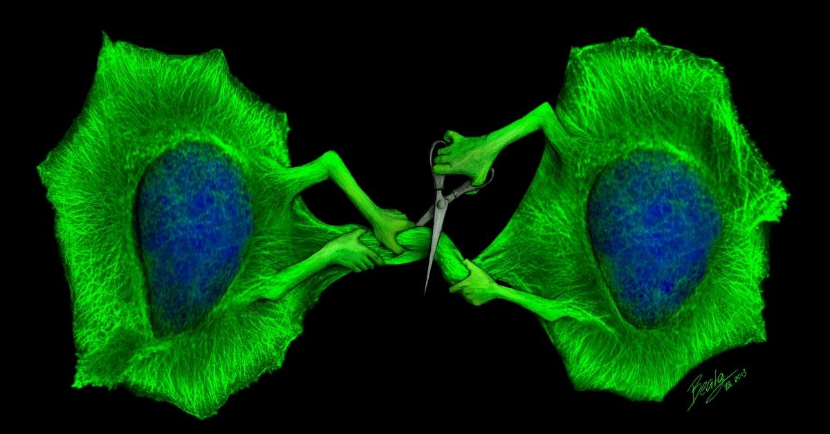 Though professionally I am a scientist first, art and creativity have been part of my life for as long as I can remember. When I was deciding what to study after high school, my three big interests were science, art, and fashion. At that time, I believed that these were mutually exclusive, and I would have never dreamed that one day I’d be able to combine all three of them to communicate science in creative ways and get people excited about biology and STEM. After studying molecular biology, I fully focused on working in the lab and never made time for creative projects. However, a few years into my PhD I got the chance to create my first science drawing about my research on the final step in cell division in which cells physically separate from each other. My drawing showed two cells holding a pair of scissors to literally cut the connection between each other. When I started using this drawing for my scientific presentations, I noticed that people would remember my research even many years later – this made me realize that visuals are an incredibly powerful tool for science communication, inspiring me to start creating illustrations for journal covers, conferences, and research groups.