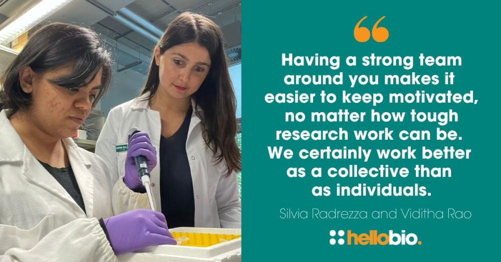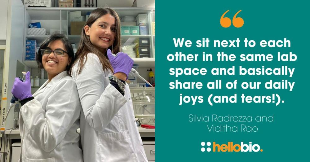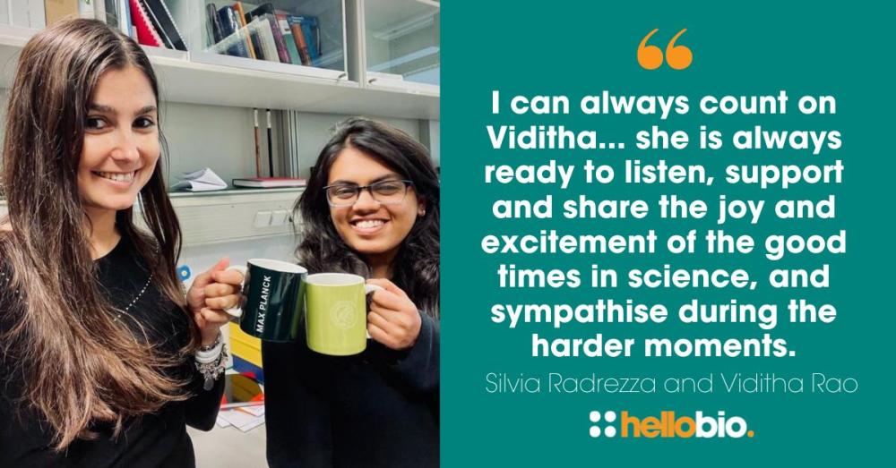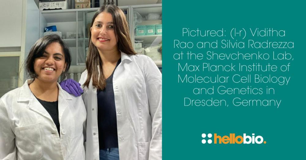 Two life scientists who’ve found the perfect blend of professional respect and personal camaraderie are Silvia Radrezza and Viditha Rao of the Max Planck Institute of Molecular Cell Biology and Genetics in Dresden, Germany. In the Hello Bio Lab Heroes Awards 2023, Silvia and Viditha both nominated each other as their own personal lab heroes, and expressed the warmth and gratitude each has for the other as both a colleague and a confidante.