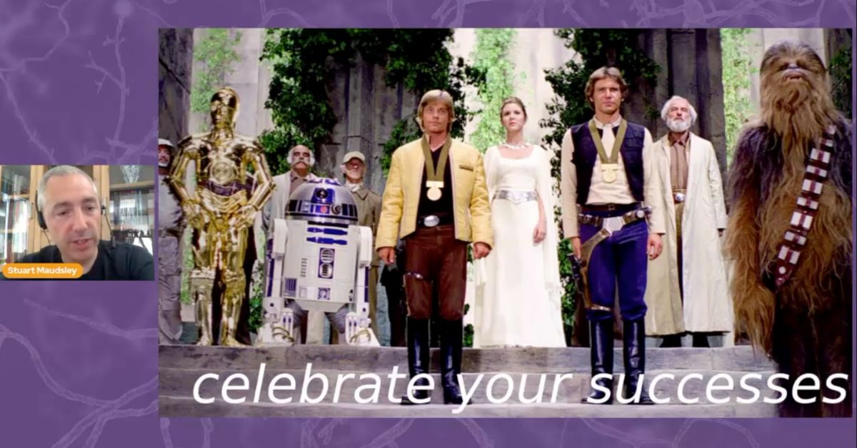 Our first guest speaker was Professor Stuart Maudsley of the Receptor Biology Lab, University of Antwerp, Belgium, who delivered our opening keynote talk on Getting The Most from Your Mentors. As an experienced mentor himself, Stuart was able to provide a real insight into the mentoring process, the importance of two-way feedback, and owning up to mistakes. He used a brilliant collection of stills from his favourite movies and TV shows to illustrate his points, including this classic scene from Star Wars to emphasise the importance of celebrating your successes!