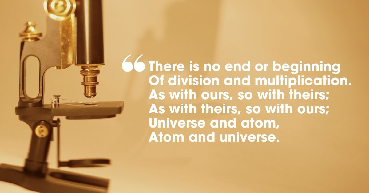 Published in 1927 in ‘Poetry: A Magazine of Verse’, this poem explores how a scientist sees atoms and molecules through the microscope. The author describes a strange and terrifying dream, brought on by the fumes of the laboratory, in which he shrinks smaller and smaller to the size of an atom while the chemist compares him to a grain of dust.