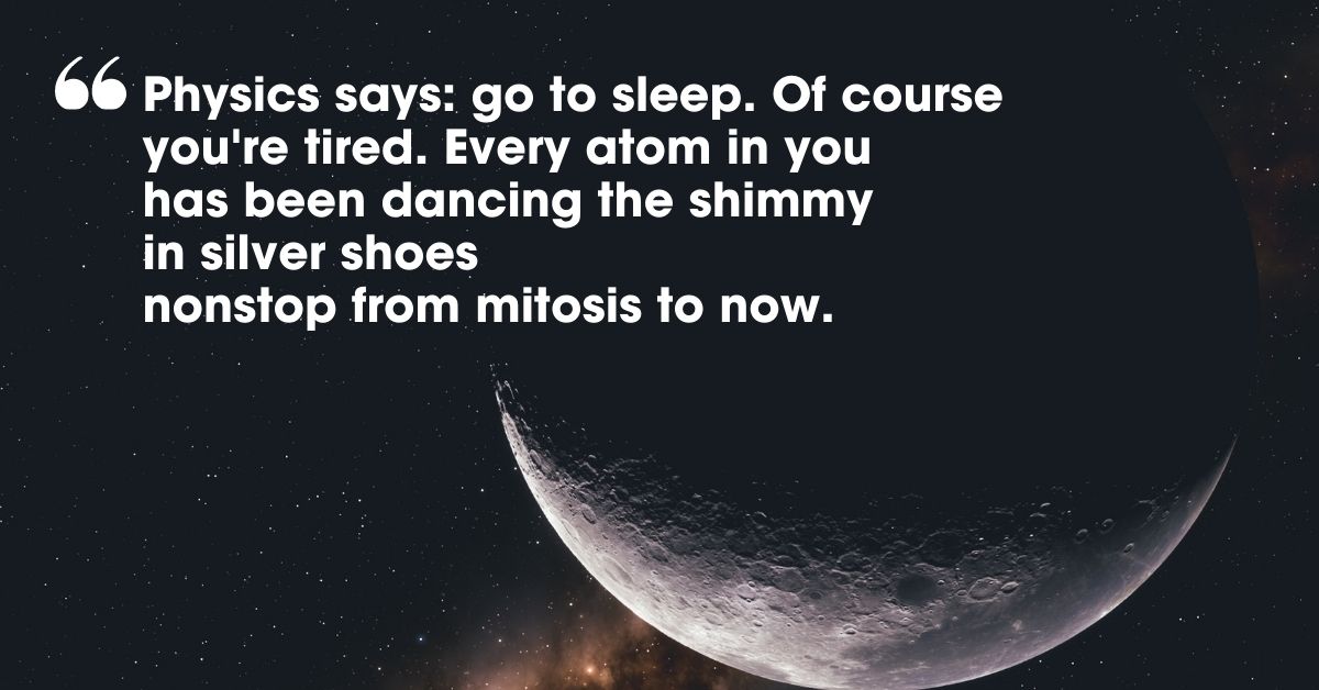 This beautiful piece by American poet Albert Goldbarth personifies the sciences as they each offer comfort to the reader in their own unique way. While ‘Physics’ reminds us that no matter how much we rest our bodies are always on the move, ‘Astronomy’ reassures us that the sun will always rise again tomorrow.