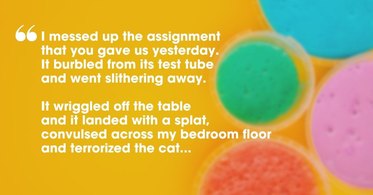 We couldn’t resist including this brilliant kid’s poem by children’s poet Kenn Nesbitt. From his book ‘Revenge of the Lunch Ladies’, this wonderful rhyming piece conjures up fantastic images of an experiment gone wrong, while flipping a common classroom excuse on its head!