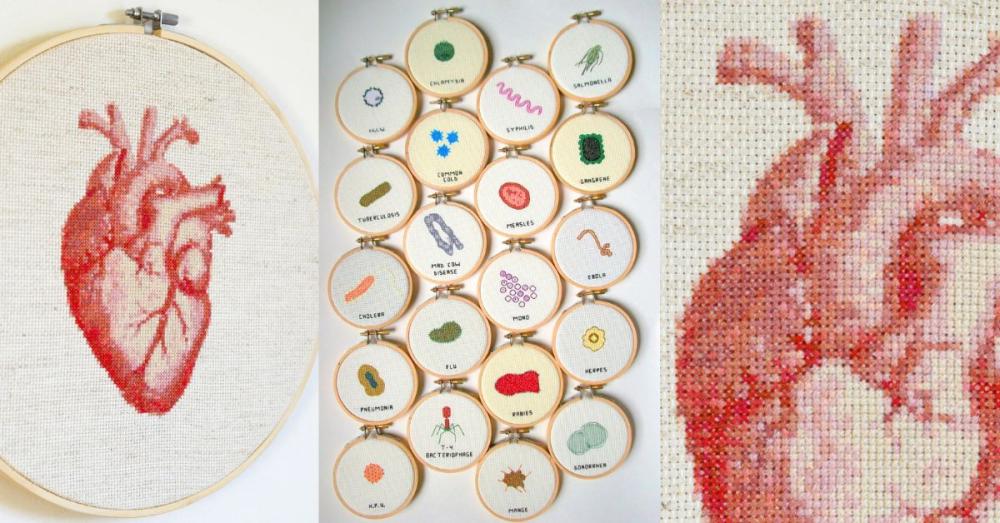 5) Heart & microbe cross stitch kits
