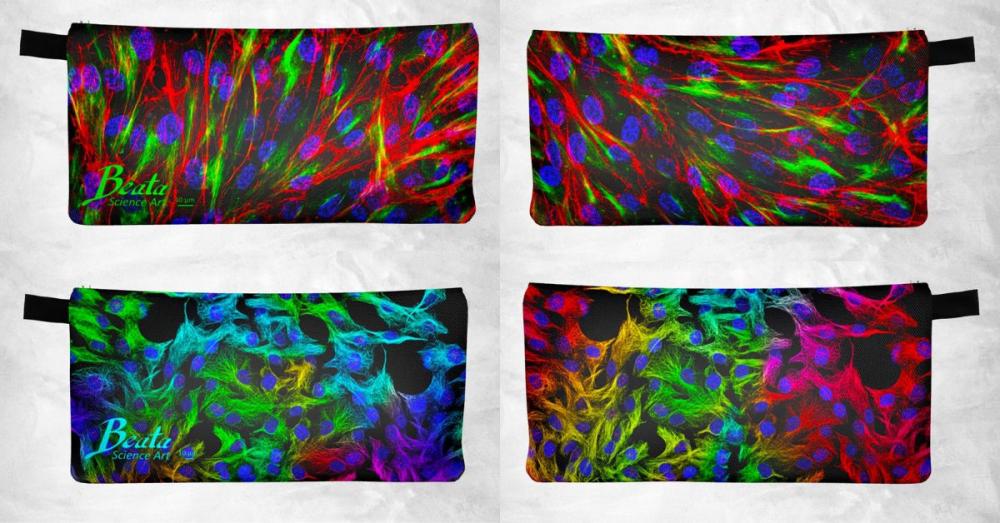 These stunning zipper pouch bags by Beata Science Art are created from real microscopy images of human cells. Each cell has a nucleus containing its DNA (blue), and other colours highlight the microtubules and actin filaments. A scale bar in the corner represents the actual dimensions of the structures. These unique pieces of science art can be used as a pencil case, make-up holder or purse!
