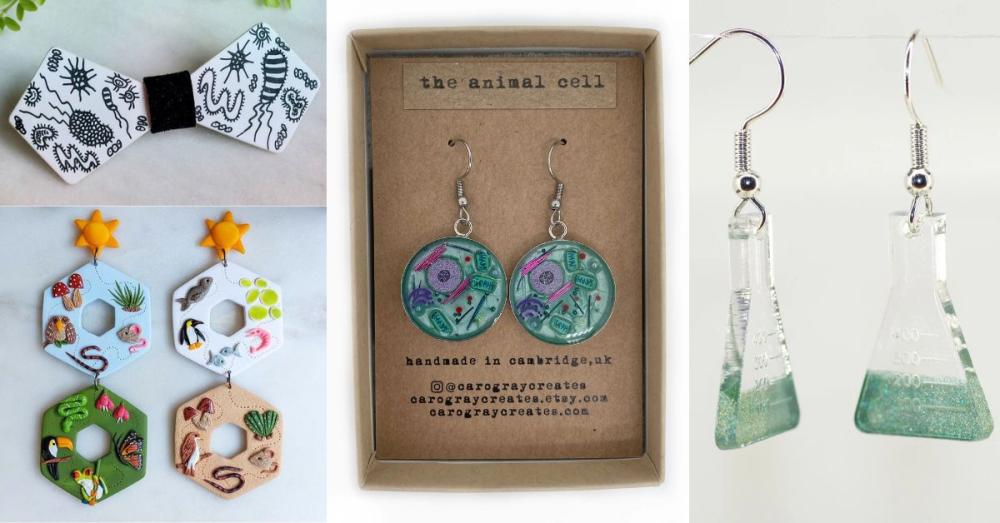 Jewelry is a great way to express one's interests, and these science-themed earrings and pins would make a great gift for your scientist friends! Caro Gray Creates has a beautiful range of handcrafted jewelry, specializing in resin pendants. Using glitter, wire, microbeads and polymer clay, she creates the key structures found within each cell type. Woodsmoke and Willow are makers of incredibly detailed biology earrings, using polymer clay to create cell designs and much more! And for the chemists, we love the work of ChemisTree Crafts who stock an extensive range of science-themed jewelry, from different shaped beakers, to test tubes representing the starch test.