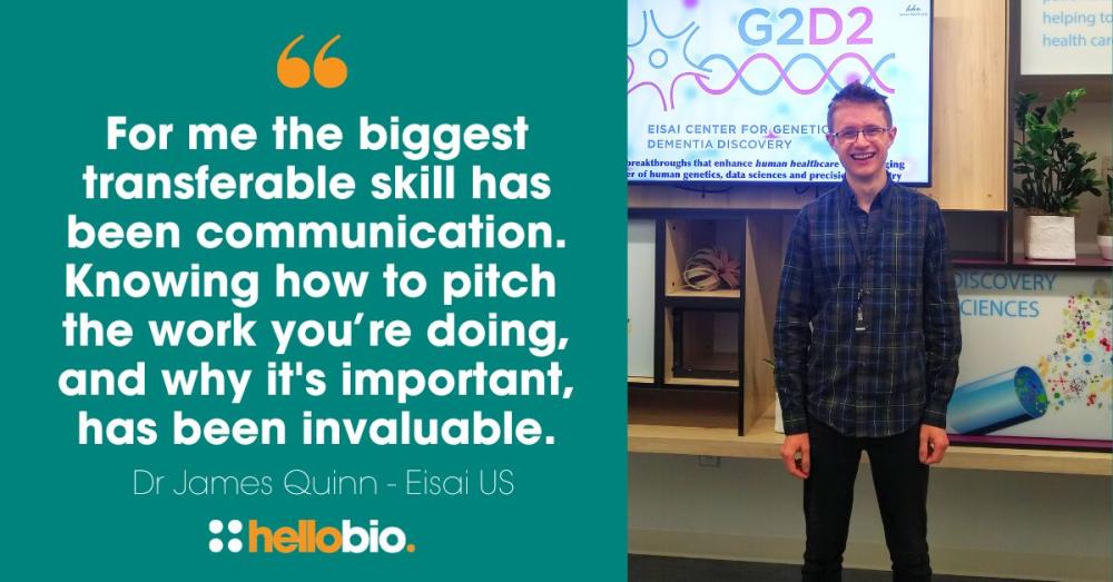Dr James Quinn is a Translational Neuroscientist who specialises in dementia research. In October 2022 he transitioned away from a postdoc role at Massachusetts General Hospital to an industry role with Eisai US (G2D2). He told us why his communication and problem-solving skills have been invaluable in his new role: “For me the biggest transferable skill by far has been communication. In this role I’m presenting multiple times a week to many different people all around the world, from scientists to directors. Knowing how to pitch the work you’re doing, and why it's important, has been invaluable. This is something I had honed a little during my time in academia, as well as the ability to just crack on with a problem. I’ve been utilizing my problem-solving skills almost daily!”