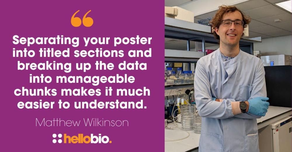 Dr Matthew Wilkinson is a Product Development Manager at Hello Bio who has previously won awards for his poster presentations. He recommends using a story-telling format which separates the information into more manageable pieces. He said: