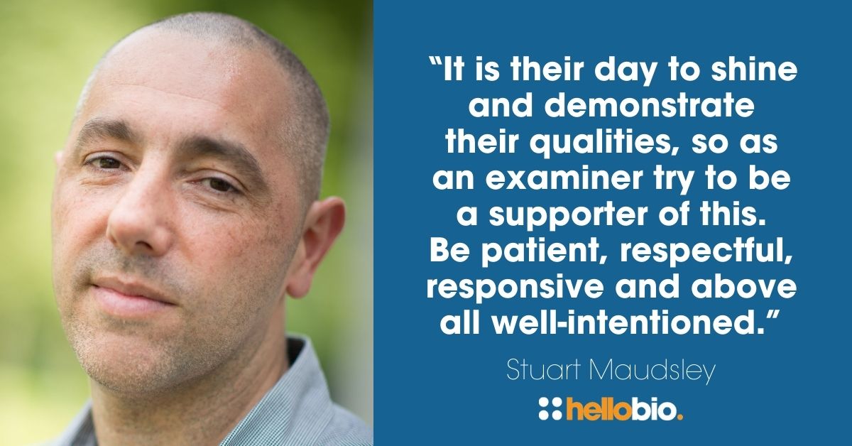 Stuart Maudsley says: “Most examiners themselves will likely be ex-viva/presentation veterans and therefore will remember what it was like to be in that seat. Put yourself in their place and try to be the ideal examiner that you would have wanted for your own presentation. Making sure that the student knows of your direct experience will hopefully create an emotional bridge between you on the day that will allow them to appreciate that your questions are coming from a position of support and good intentions.”