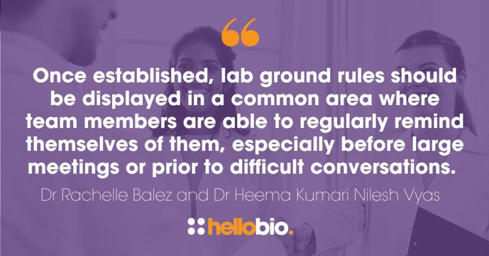 Setting out a basic list of ground rules for the lab is a great way to manage expectations and ensure everyone is on the same page when it comes to working together effectively. In the article Workplace Wellbeing For Life Scientists, Dr Rachelle Balez and Dr Heema Kumari Nilesh Vyas share some valuable advice on setting basic rules within your lab: “Ground rules are agreed-to guidelines that define how individuals are expected to communicate, participate, collaborate, and support one another. Once established, they should be displayed in a common area where team members are able to regularly remind themselves of them, especially before large meetings or prior to having difficult conversations. It’s an efficient way to collectively define norms that allow lab groups to function in a respectful and inclusive manner – especially when important and complex decisions need to be made.”