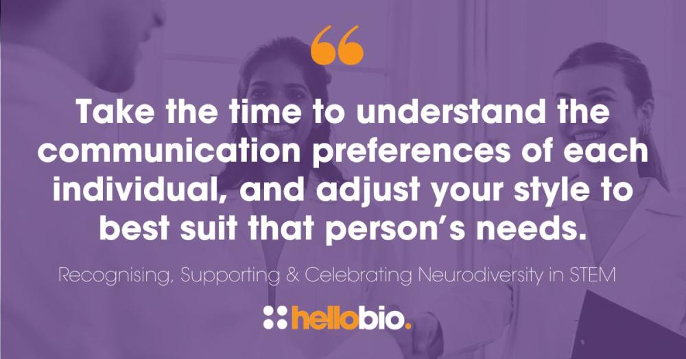 Be aware that some team members may prefer to communicate in different ways, and might respond better to alternative methods. This is particularly relevant if you or a colleague are neurodivergent and find some types of verbal communication challenging, especially in group situations. In this article on the Hello Bio blog, we considered the types of communication challenges faced by neurodivergent researchers, and what colleagues should keep in mind when working alongside them: “Be mindful about how information is communicated, and be sure to use clear and direct language. Provide written instructions where necessary. PIs, lab managers and other mentors should take the time to understand the communication preferences of each individual, and adjust their mentorship style to best suit that person’s needs.”