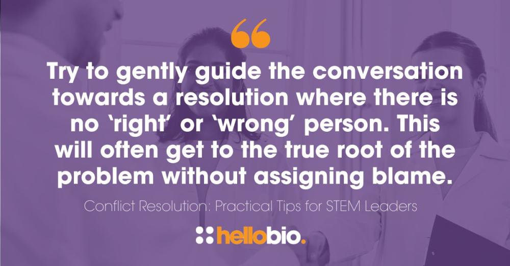 When a dispute arises between lab colleagues, it’s possible that another team member will be asked to act as a mediator. Again this is something that can be practised through training or management courses, and is a useful skill to have in all walks of life, not just in a professional environment. The role of a mediator is never to start, lead or dominate a discussion, rather to provide support so that both parties feel heard and that their feelings have been recognised and considered. In the same article, we considered ways in which mediators can diffuse situations by not assigning blame but by empowering both parties: “Try to gently guide the conversation towards a resolution where there is no ‘right’ person or ‘wrong’ person. Allow everyone to recognise and understand the feelings and emotions for all involved and to find a place where all parties are comfortable. This will often get to the true root of the problem without assigning blame.”