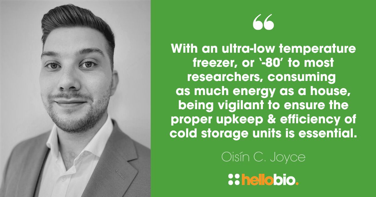 It’s a well-known fact that lab equipment such as computers, fridges and freezers, air ventilation systems and other instruments use a lot of power. In fact it’s estimated that labs use at least 3 times the amount of energy a regular office building uses. Proper storage of samples is essential in the lab, but Oisín reminds us of the cost: “With an ultra-low temperature freezer, or ‘-80’ to most researchers, consuming as much energy as a house, being vigilant to ensure the proper upkeep and efficiency of cold storage units is essential.” Adriana Wolf Perez of The Caring Scientist podcast agrees: “Reducing electricity usage in labs and optimizing cold storage can have a big impact in terms of reducing CO2 emissions.”