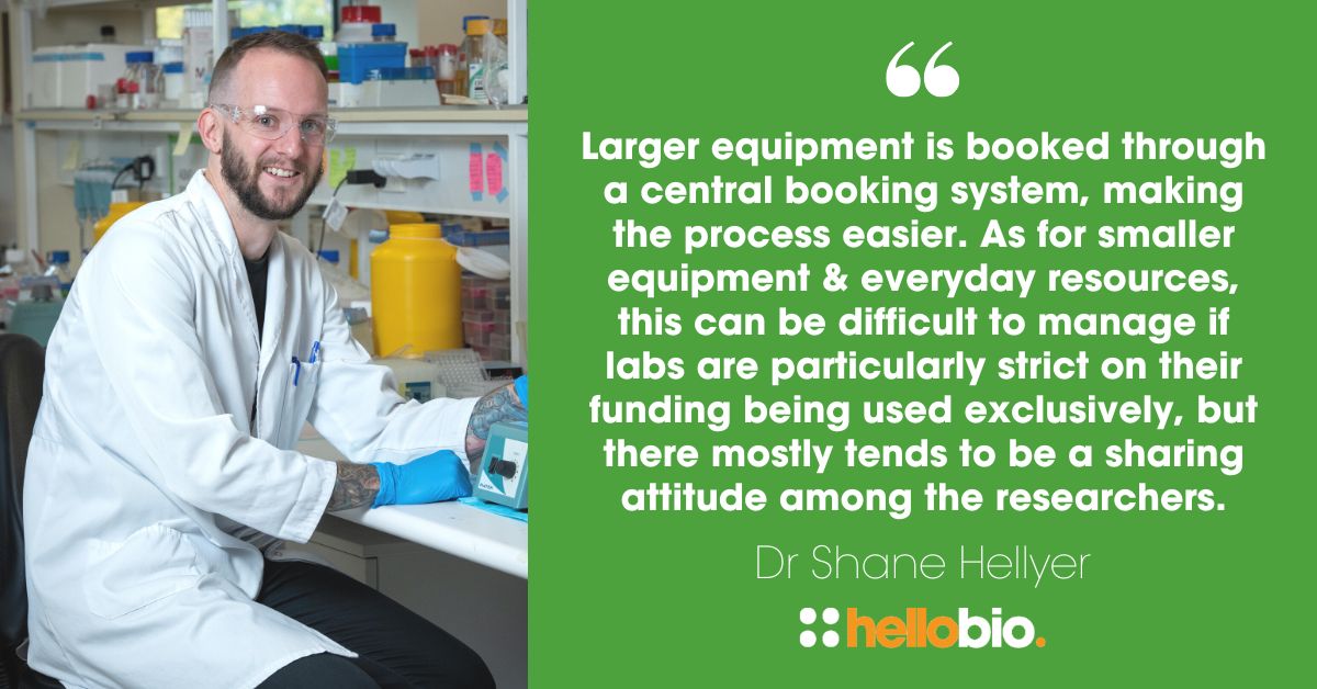 Shane told us about the challenges his team have faced when sharing resources: “While most labs in our department have their own consumables, there is a lot of sharing of equipment and resources. Our larger equipment is all booked through a central booking system, which makes the process easier. As for smaller equipment and everyday resources, this can be difficult to manage if labs are particularly strict on their funding being used exclusively for their lab, but there mostly tends to be a sharing attitude among the researchers.”