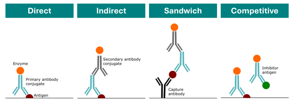 There are four main types of ELISA: Direct, Indirect, Sandwich and Competitive.