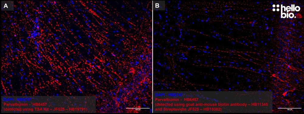 Biotin Tyramide Signal AmplificationBiotin Tyramide signal amplification (TSA) utilizes horse radish peroxidase (HRP) to enzymatically convert biotin tyramide to bind tyrosine residues on and surrounding the protein epitope targeted by the primary antibody, which can then be detected using streptavidin conjugates. We offer a range of Biotin Tyramide Signal Amplification kits to enhance signal of low abundance targets. Rat hippocampus stained for parvalbumin anti-mouse ValidAbTM antibody detected using Biotin Tyramide Signal Amplification Kit - Janelia Fluor® 525 (HB19791) compared to conjugation with Streptavidin Janelia Fluor® 525 (HB15382). |